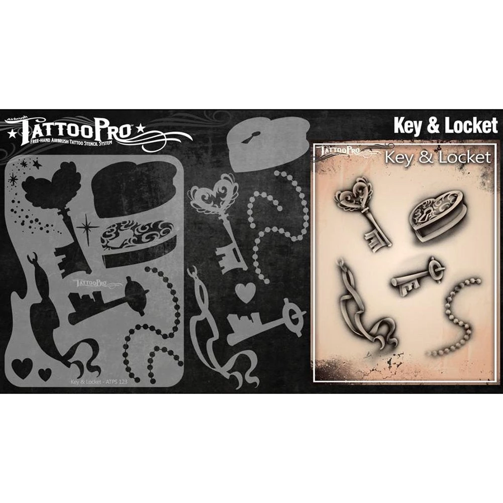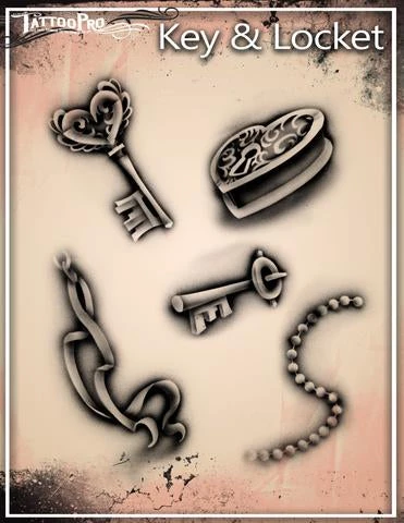 The Key & Locket design sheet features 2 different Key stencils, 1 Locket stencil, 1 Ribbon stencil, 1 Pearl String stencil, and other elements used to create realistic airbrush tattoos.